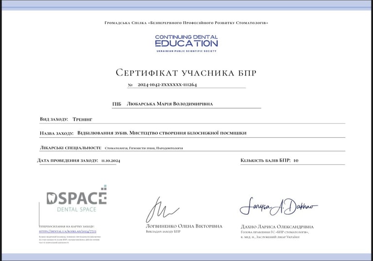 Сертифікат. Тренінг: Відбілювання зубів. Мистецтво створення білосніжної посмішки