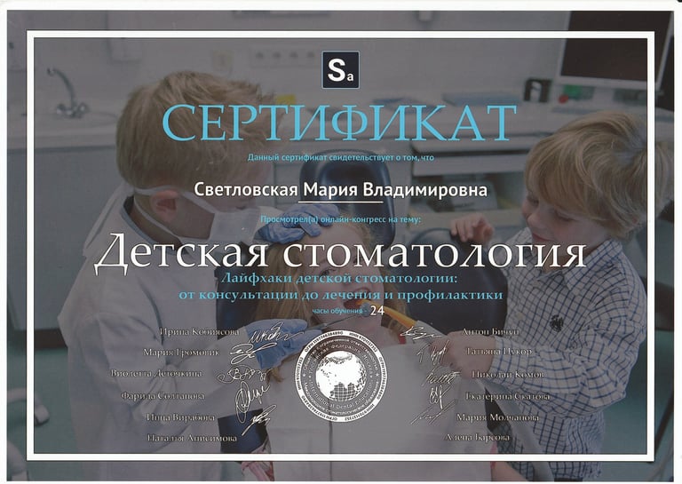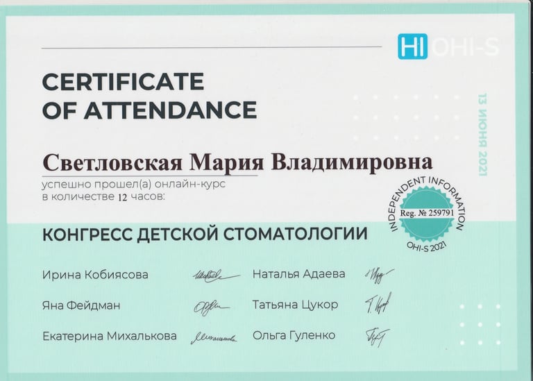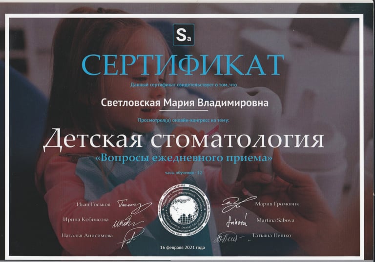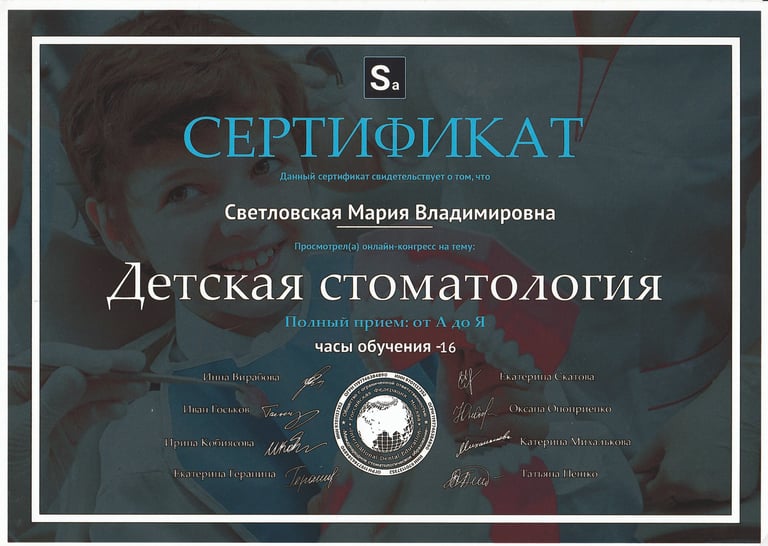Сертифікат. Онлайн конгрес на тему: "Дитяча стоматологія. Повний прийом від А до Я."