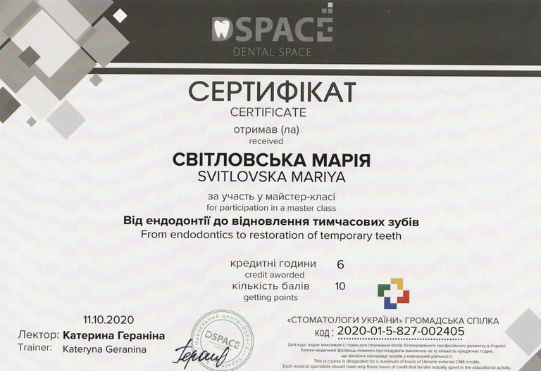 Сертифікат за участь в майстер-класі:"Від ендодонтії до відновлення тимчасових зубів