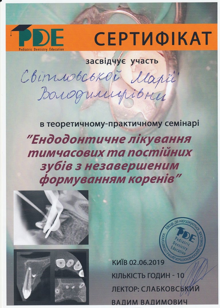 Сертифікат.Теоретично-практичний семінар. Ендодонтичне лікування тимчасових та постійних зубів з незавершеним формуванням коренів.