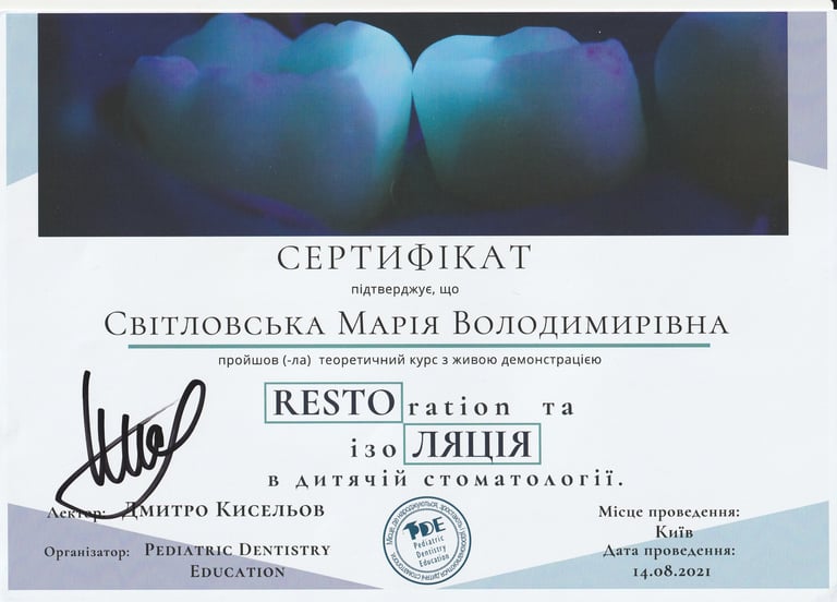 Сертифікат. Реставрація та ізоляція в дитячій стоматології.