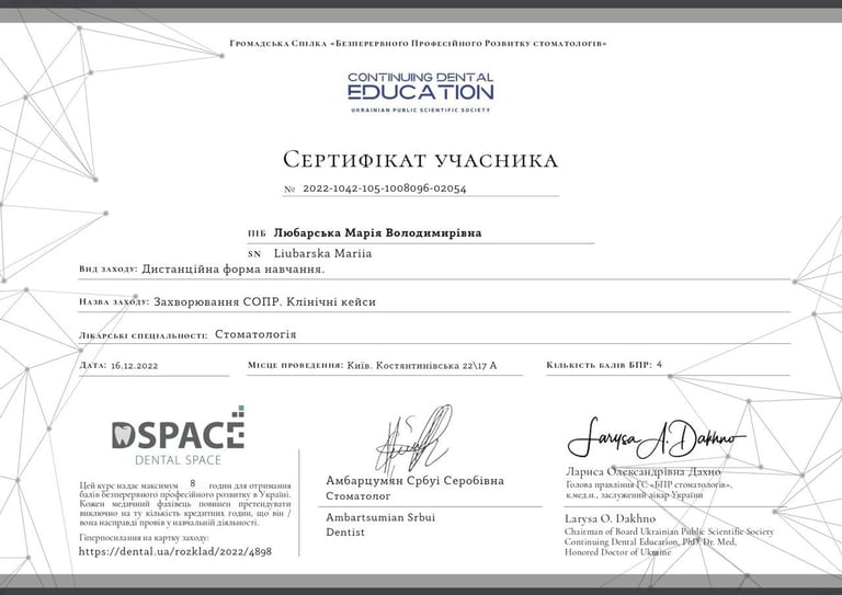 Сертифікат. Майстер клас на тему: "Ендо-ресто лікування(пульпотомія, облітерація каналів, штучний інтелект, вініри, анестезія і токсичність анестетиків) Доказово. Практично. Доступно."